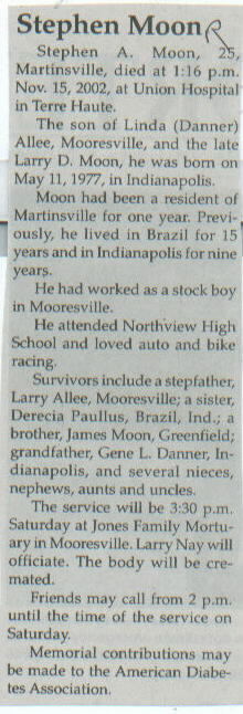 | Survived By | Mother, Linda (Danner) Allee; stepfather, Larry Allee; sister, Derecia Paullus; brother, James Moon; grandfather, Gene L. Danner; several nieces, nephews, aunts and uncles. |