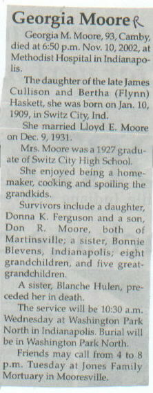| Survived By | Spouse; daughter, Donna K. Ferguson; son, Don R. Moore; sister, Bonnie Blevens; 8 grandchildren; 5 great-grandchildren. |