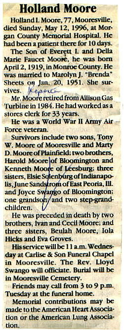 Other Age 77. Carlisle Chapel (Rev. Lloyd Swango.) Buried Mooresville Cemetery. Veteran World War II, US Air Force. Parents: Everett I. and Della Marie Faucet Moore. Died at Morgan County hospital. Born in Monroe County. Preceded in death by two brothers and three sisters.