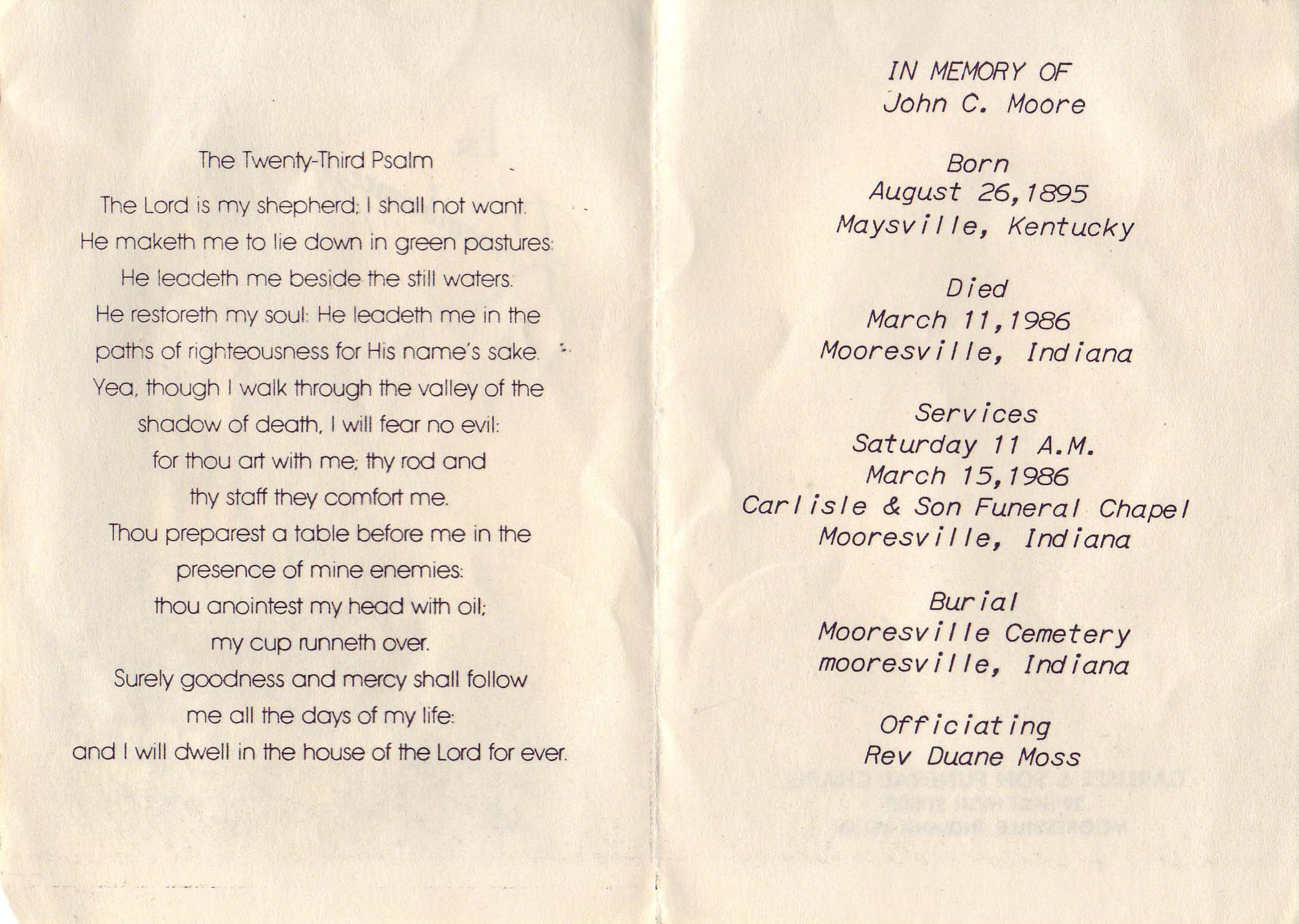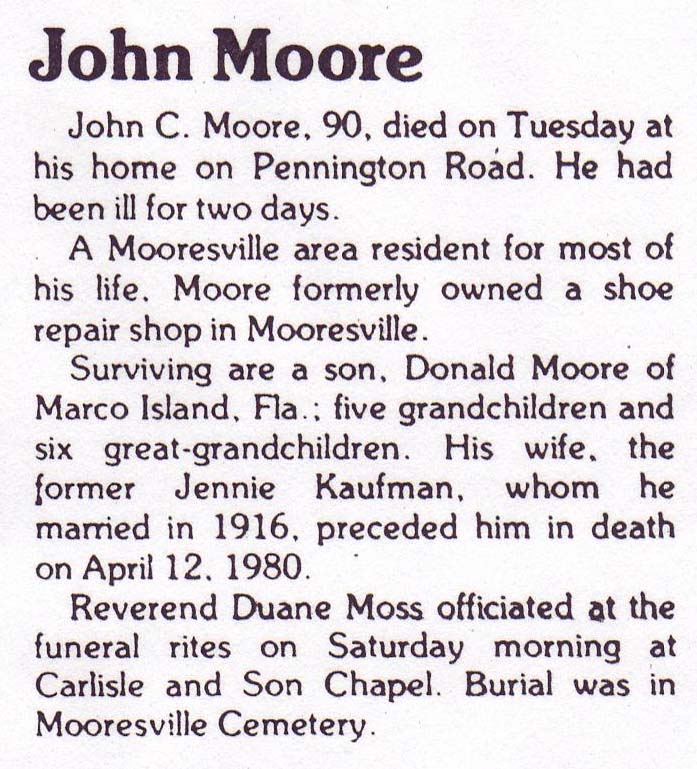 Other Carlisle funeral (Rev. Duane Moss officiating.) Buried Mooresville Cemetery. In shoe repair business for many years.