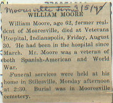 Other Age 62. Funeral at his home in Stilesville. Buried Mooresville Cemetery. Veteran of Spanish-American War and World War I.
