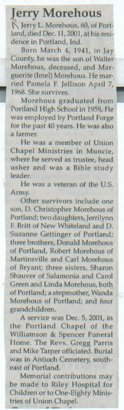 | Survived By | Spouse; mother, Marguerite (Imel) Morehous; son, D. Christopher Morehous; daughters, Jerrilynn F. Britt and D. Suzanne Gettinger; brothers, Donald, Robert, and Carl Morehous; sisters, Sharon Shauver, Carol Green, and Linda Morehous; 4 grandchildren. |