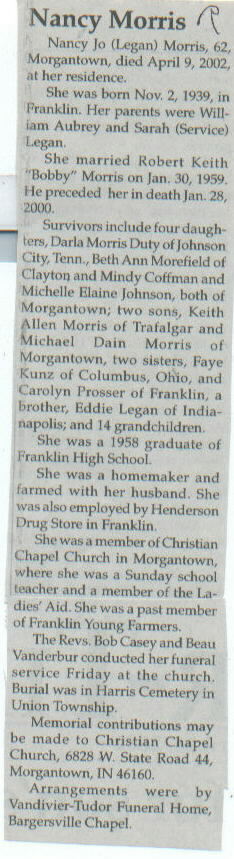| Survived By | Four daughters, Darla Morris Duty, Beth Ann Morefield, Mindy Coffman, and Michelle Elaine Johnson; 2 sons, Keith Allen Morris and Michael Dain Morris; 2 sisters, Faye Kunz and Carolyn Prosser; brother, Eddie Legan; 14 grandchildren. |