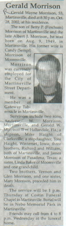 | Survived By | Former wife; two sons, Andrew W. and Gerald W. Morrison; stepson, Mike Haight; stepdaughter, Toni Haight; 3 brothers, Richard, William, and James Morrison; sister, Linda Baker; one grandchild. |