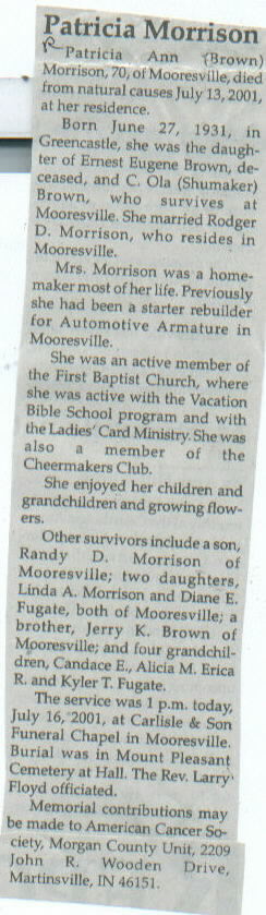 | Survived By | Spouse; mother, C. Ola (Shumaker) Brown; son, Randy D. Morrison; daughters, Linda A. Morrison and Diane E. Fugate; brother, Jerry K. Brown; 4 grandchildren. |