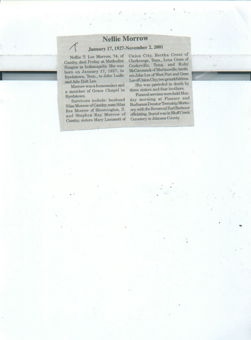| Survived By | Spouse; sons, Silas Rex and Stephen Ray Morrow; sisters, Mary Lammott, Bertha Cross, Lena Cross, and Ruby McCammack; brothers, John and Gene Lee; 2 grandchildren. |