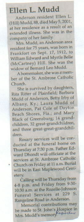 | Survived By | Daughters, Rita Ritter, Barbara Mudd, Betty Irby, Laura Mudd, Pat Cole, and Mary Black; 14 grandchildren; 32 great-grandchildren; 3 great-great-grandchildren. |