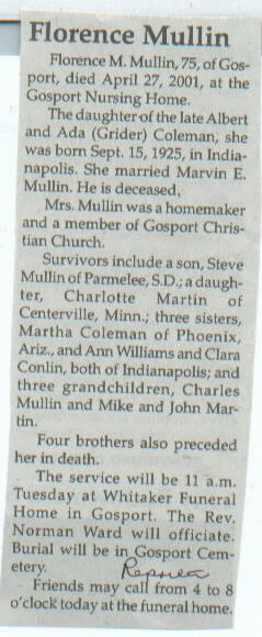 Other Preceded in death by spouse; parents, Albert and Ada (Grider) Coleman; 4 brothers.