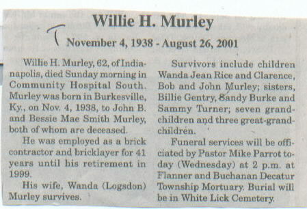 Survived By Spouse; children, Wanda Jean Rice and Clarence, Bob, and John Murley; sisters, Billie Gentry, Sandy Burke, and Sammy Turner; 7 grandchildren; 3 great-grandchildren.