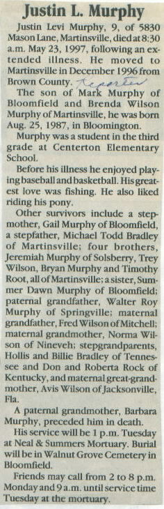 | Survived By | Parents, Mark Murphy of Bloomfield and Brenda Wilson Murphy of Martinsville; stepmother; stepfather; 4 brothers; sister; grandparents; stepgrandparents; great-grandmother. |