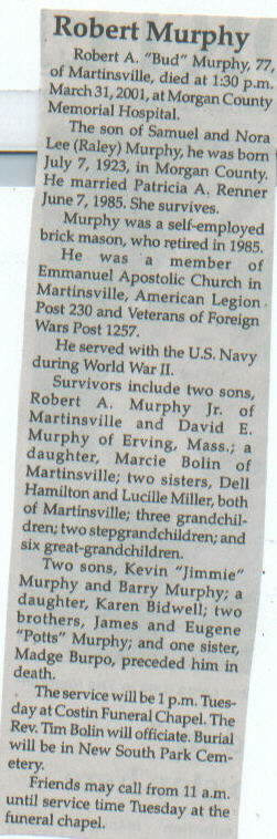 | Survived By | Spouse; sons, Robert A. Murphy, Jr. and David E. Murphy; daughter, Marcie Bolin; sisters, Dell Hamilton and Lucille Miller; 3 grandchildren; 6 great-grandchildren. |