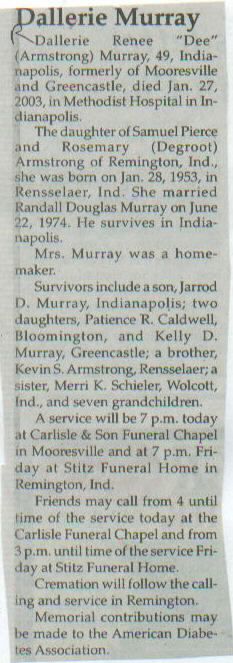 | Other | Age 49. Daughter of Samuel Pierce and Rosemary (Degroot) Armstrong of Remington, Ind. Cremation will follow the calling and service in Remington. |