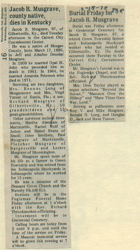 | Other | Age 87. Fogleman Funeral Home, Martinsville. Buried Centennial cemetery. Parents: Jeff and Ariadne Dressler Musgrave. Retired from Indpls. Stock yards. Member Mt. Pleasant Grove Church. Died in Gilbertsville. |
