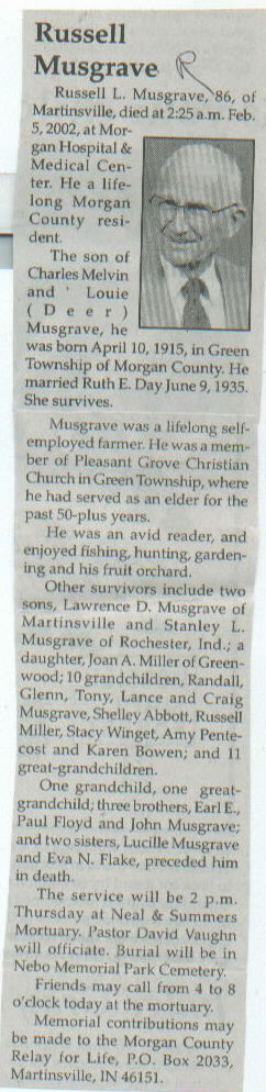 | Survived By | Widow; 2 sons, Lawrence D. and Stanley L. Musgrave; daughter, Joan A. Miller; 10 grandchildren, Randall, Glenn, Tony, Lance and Craig Musgrave, and Shelly Abbott, Russell Miller, Stacy Winget, Amy Pentecost, and Karen Bowen; 11 great-grandchildren. |