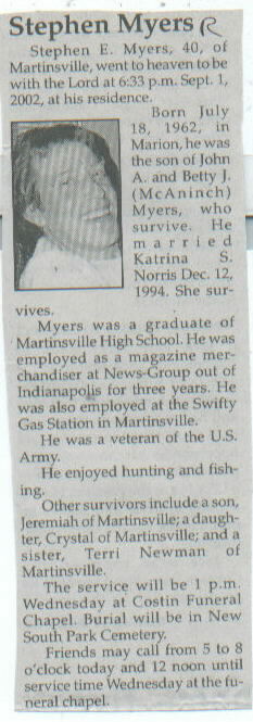 | Survived By | Spouse; parents, John A. and Betty J. (McAninch) Myers; son, Jeremiah Myers; daughter, Crystal Myers; sister, Terri Newman. |