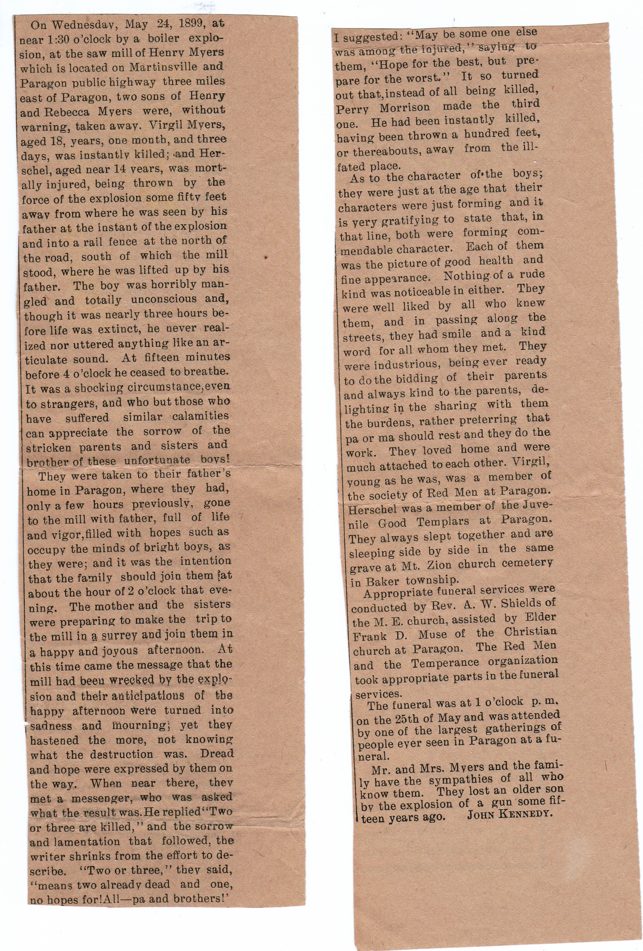 | Other | Age 18 years, 1 month, and 3 days. Was instantly killed when the boiler exploded at the Myers saw mill on the Paragon Road. He was caught by the flying debris and buried by the timbers and fragments of iron. [Saw mill was owned by his father, Henry Myers.] Also killed in the explosion were his brother, Hirschel Myers, age 14, and another worker, Perry Morrison, age 23. |