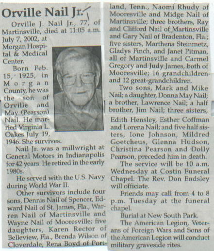 | Survived By | Widow; 4 sons, Dennis, Edward, Warren, and Wayne Nail; 5 daughters, Karen Rector, Brenda Wilson, Rena Boyd, Naomi Rhudy, and Midge Nail; 3 brothers, Ray, Clifford, and Gary Nail; 5 sisters, Marthen Steinmetz, Gladys Finch, Janet Pitman, Carmel Gregory, and Judy James; 16 grandchildren; 12 great-grandchildren. |