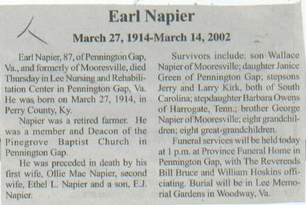 | Other | A son, E. J. Napier, and both wives preceded him in death. |