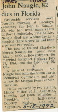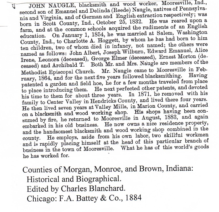 | Other | Age 65. Born in Scott Co., Ind. Second son of Emanuel and Delinda Reede Naugle. Married Charlotte A. Hoggett on Jan. 1, 1854, in Salem, Washington Co., Ind. They had ten children, two of whom died in infancy; John Albert, Joseph Wilburn, Edward Emanuel, Alice Irene, Archibald T., and Leonora, George Elmer, and Ernest Morton. (The last three named died young.) Mr. Naugle came to Mooresville in Feb. 1864 as a blacksmith. Moved to Hendricks Co., then Valley Mills, then back to Mooresville. Patented garden & field hoe. Buried in Naugle family plot, Mooresville Cemetery. |