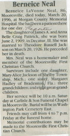 Other Age 86. Carlisle Chapel. Buried Washington Park cemetery East. Died in Morgan Co. hospital; born in Decatur, Illinois.