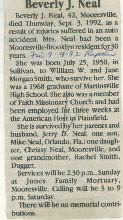 | Survived By | Husband; parents, William W. and Jane Morgan Smith; son, Mike Neal of Orlando, Fla.; daughter, Chrissy Neal of Mooresville; grandmother, Rachel Smith of Dugger, Ind. |