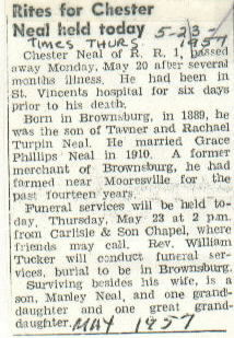 | Other | Carlisle Chapel (Rev. William Tucker.) Buried in Brownsburg. Former merchant in Brownsburg. Retired, and farmed west of Mooresville for the last 14 years. Parents: Tavner and Rachael Turpin Neal. |