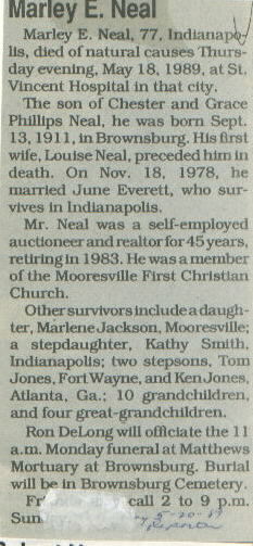 | Other | Age 77. Matthews Mortuary, Brownsburg (Rev. Ron DeLong.) Buried Brownsburg Cemetery. Auctioneer and real estate agent. Member Mooresville Christian Church. Died at St. Vincent's Hospital; born in Brownsburg. |