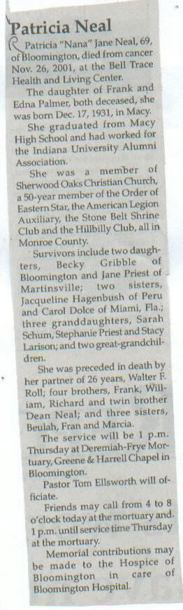 | Other | Age 69. Preceded in death by parents, Frank and Edna Palmer; brothers, Frank, William, Richard, and twin brother, Dean Neal; sisters, Beulah, Fran, and Marcia. |