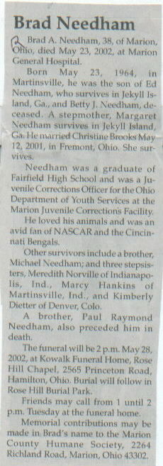 | Survived By | Widow; father, Ed Needham; stepmother, Margaret Needham; brother, Michael Needham; 3 stepsisters, Meredith Norville, Marcy Hankins, and Kimberly Dietter. |