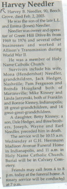 | Other | Age 90. He was the son of the late L.L. and Emma (Jones) Needler. Preceded in death by a daughter, Betty Kinney; a son, Dale Hedger; and three brothers, Joseph, Wayne, and Earl Needler. |