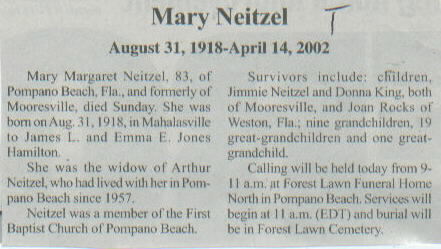| Survived By | Children, Jimmie Neitzel, Donna King, and Joan Rocks; 9 grandchildren; 19 great-grandchildren; one great-grandchild. |