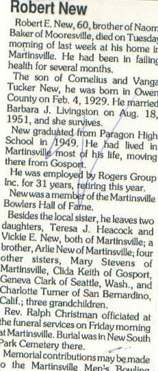 | Survived By | Wife; daughters, Teresa J. Heacock and Vickie New; brother, Arlie New; sisters, Naomi Baker, Mary Stevens, Clida Keith, Geneva Clark, and Charlotte Turner. |