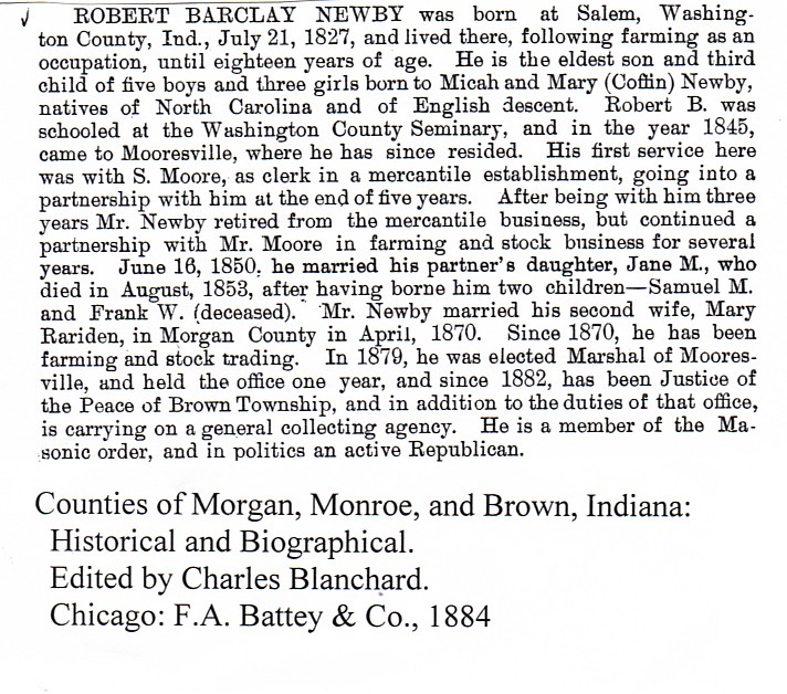 | Other | Age 63. Born at Sale, Washington Co., Ind. Eldest son and third child of five boys and three girls born to Micah and Mary Coffin Newby. Came to Mooresville in 1845; worked with Samuel Moore, founder of the town. On June 16, 1850, he married his partner's daughter, Jane M. Moore; they had two children together: Samuel M. and Frank W. (deceased). Jane died August 24, 1853. Mr. Newby married Mary Rariden in Morgan Co., Ind. on April 18, 1870. |
