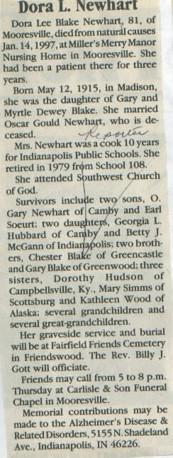 | Survived By | Sons, O. Gary Newhart and Earl Soeurt; daughters, Georgia L. Hubband and Betty J. McCann; brothers, Chester and Gary Blake; sisters, Dorothy Hudson, Mary Simons, and Kathleen Wood. |