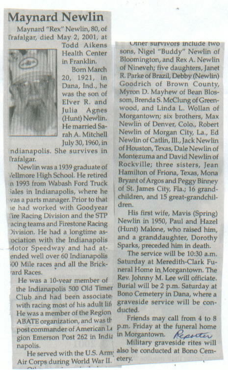 | Other | Preceded in death by parents, Elver R. and Julia Agnes (Hunt) Newlin; first wife, Mavis (Spring) Newlin; Paul and Hazel (Hunt) Malone; granddaughter, Dorothy Sparks. Served with U.S. Army Air Corps, World War II. |