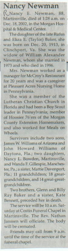 | Survived By | Two sons, James W. Williams and John Howard Williams; 2 daughters, Nancy L. Bowden and Wanda F. Gillespie; sister, Mattie Davenport; 11 grandchildren; 18 great-grandchildren; 14 great-great-grandchildren. |