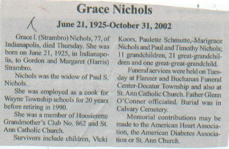 | Survived By | Children, Vicki Koors, Paulette Schmutte, Marigrace Nichols, and Paul and Timothy Nichols; 11 grandchildren; 21 great-grandchildren; one great-great-grandchild. |