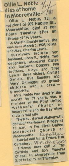 | Survived By | Husband; daughters, Margaret Cislak and Barbara Cooper; brothers, Floyd and True Lewis; sisters, Christa Daniels, Eva Sanders, and Mary Ohlrogge. |