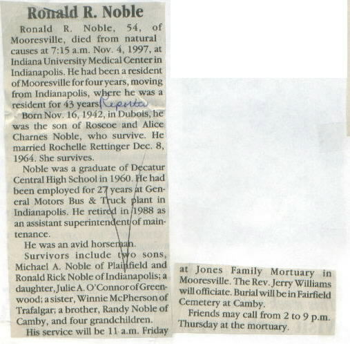 | Survived By | Wife; parents, Roscoe and Alice Charnes Noble; sons, Michael A. and Ronald Rick Noble; daughter, Julie A. O'Connor; sister, Winnie McPherson; brother, Randy Noble. |