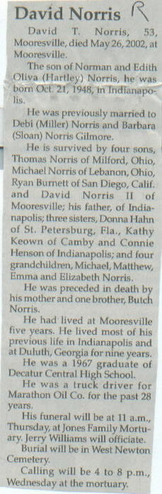 | Survived By | Sons, Thomas and Michael Norris, Ryan Burnett, and David Norris II; father, Norman Norris; 3 sisters, Donna Hahn, Kathy Keown, and Connie Henson; 4 grandchildren, Michael, Matthew, Emma, and Elizabeth Norris. |
