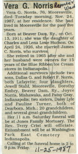 | Survived By | Husband; sons, Dallas G. and Robert F. Norris; daughters, Jewel Stahl, Dorothy Embry, Joyce Norris, and Patsy Gray; sisters, Daisy Lyle and Pauline Turner. |