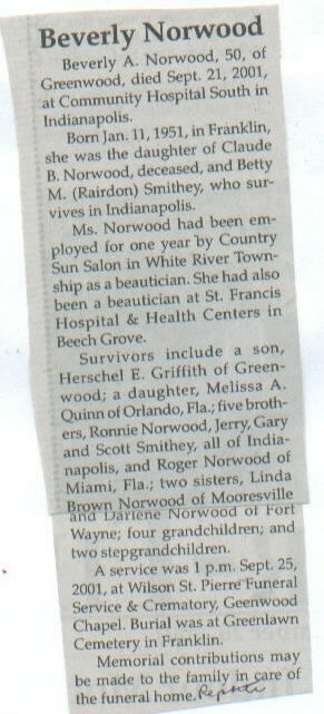 | Survived By | Mother, Betty M. (Rairdon) Smithey; son, Herschel E. Griffith; daughter, Melissa A. Quinn; brothers, Ronnie and Roger Norwood, and Jerry, Gary, and Scott Smithey; sisters, Linda Brown Norwood and Darlene Norwood; 4 grandchildren. |