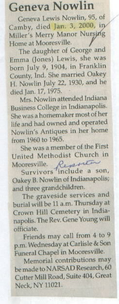 | Other | Age 95. Carlisle graveside service; burial Crown Hill Cemetery. Parents: George and Emma Jones Lewis. Owned Nowlin Antiques on State Road 67 near Camby, 1960-1965. Died at Miller's Merry Manor. |