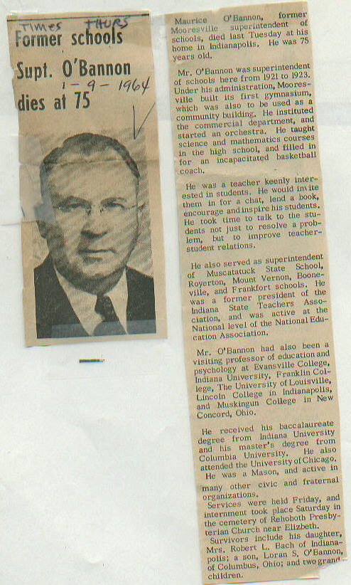 | Survived By | Wife, Gertrude; daughter, Mrs. Robert L. Bach; son, Loran S. O'Bannon. |