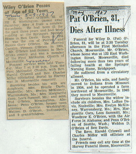 | Survived By | Wife; daughters, Mrs. Ercelle Davis, Mrs. Evelyn McKinney, and Mrs. Marguerite Corn; sons, Ted, Penn, and Weldon D. O'Brien. |