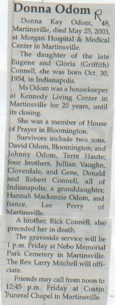 Survived By Two sons, David and Johnny Odom; 4 brothers, Julian Vaughn, and Gene, Donald, and Robert Connell; granddaughter, Hannah Mackenzie Odom; fiance, Lee Perry.
