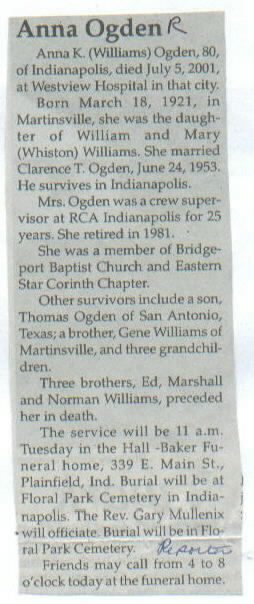 Other Preceded in death by parents, William and Mary (Whiston) Williams; brothers, Ed, Marshall, and Norman Williams.