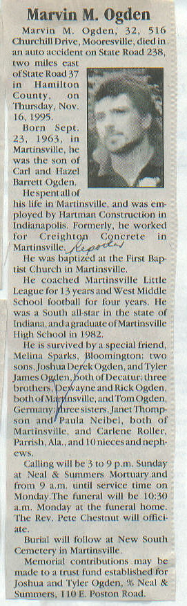| Survived By | Sons, Joshua Derek and Taylor James Ogden; brothers, Dewayne, Rick, and Tom Ogden; sisters, Janet Thompson, Paula Neibal, and Carlene Roller. |