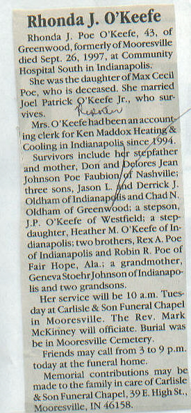 | Survived By | Husband; mother and step-father, Don and Delores Faubion; sons, Jason L., Derrick, and Chad Oldham; brothers, Rex and Robin Poe. |