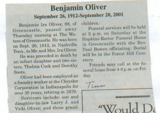 | Other | Age 88. Preceded in death by parents, Mr. & Mrs. Ira Oliver; sisters, Thelma Cook and Dorothy Soots; infant daughter. |